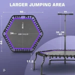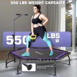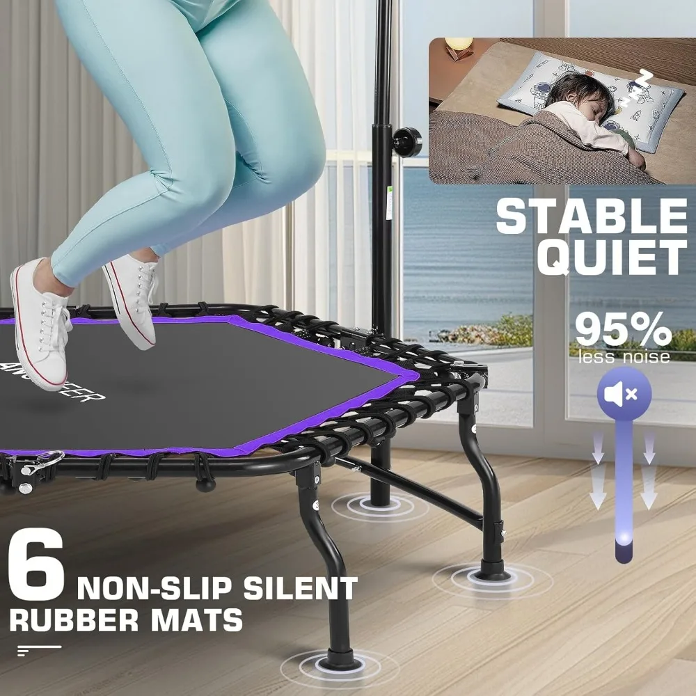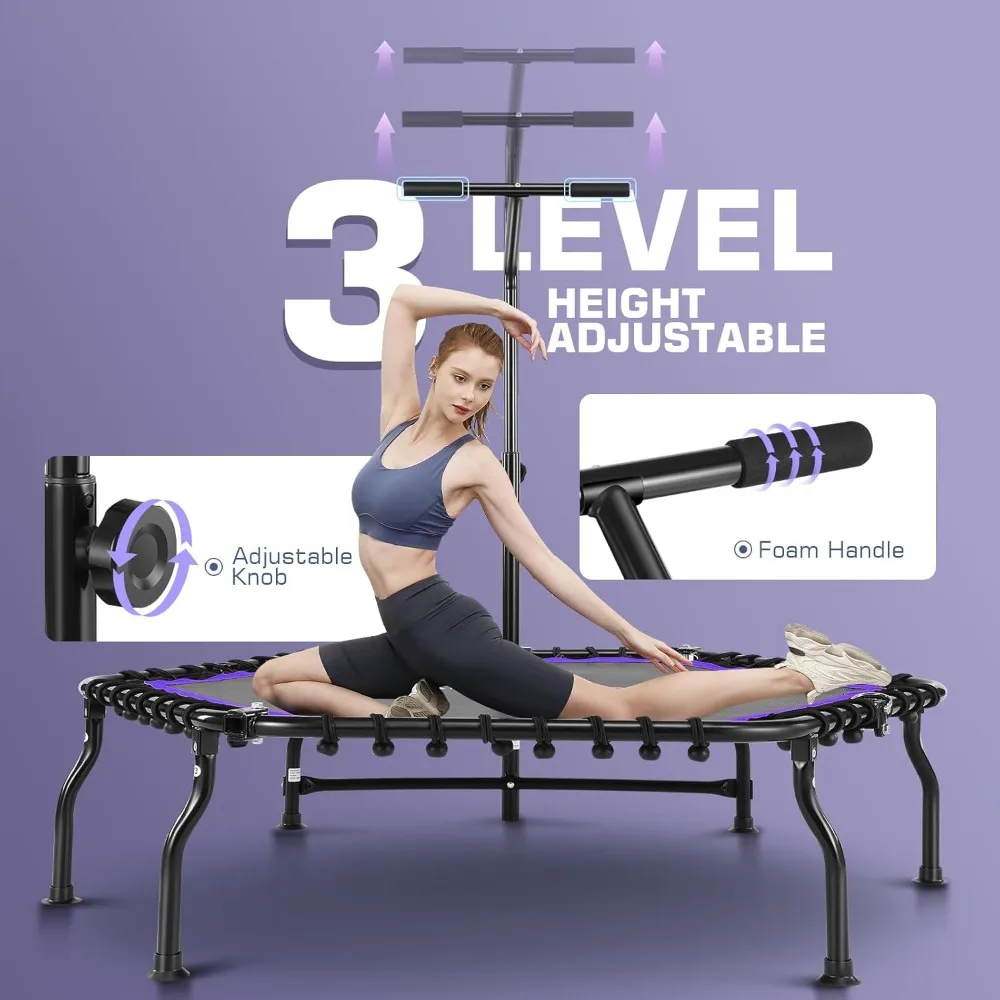 - 【3 Levels Adjustable Handle】3 levels of height adjustable handle (up to 50 inches), suitable for adults and teenagers. Foam-covered handrails prevent sweat from corroding the handles, which enhances balance, flexibility and coordination. Removable handrail bars are designed for easy carrying and storage of the trampoline. Maximum weight capacity 550 lbs.